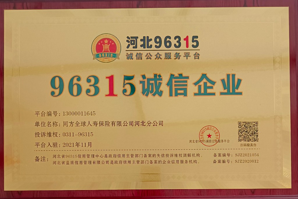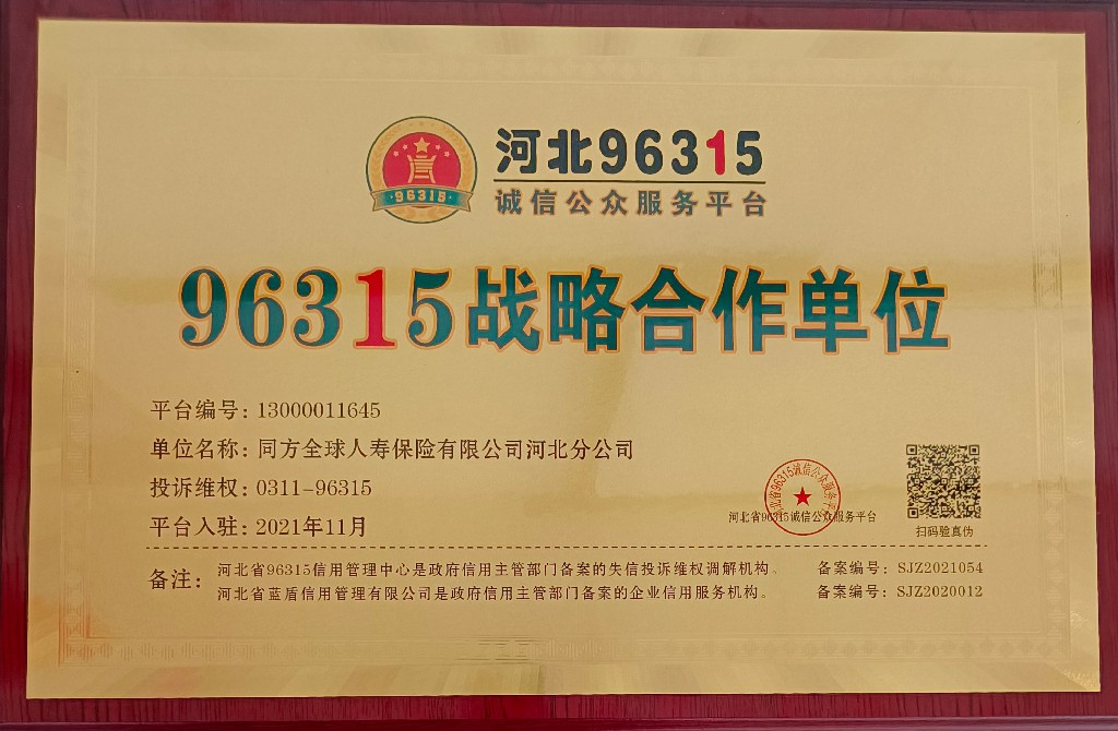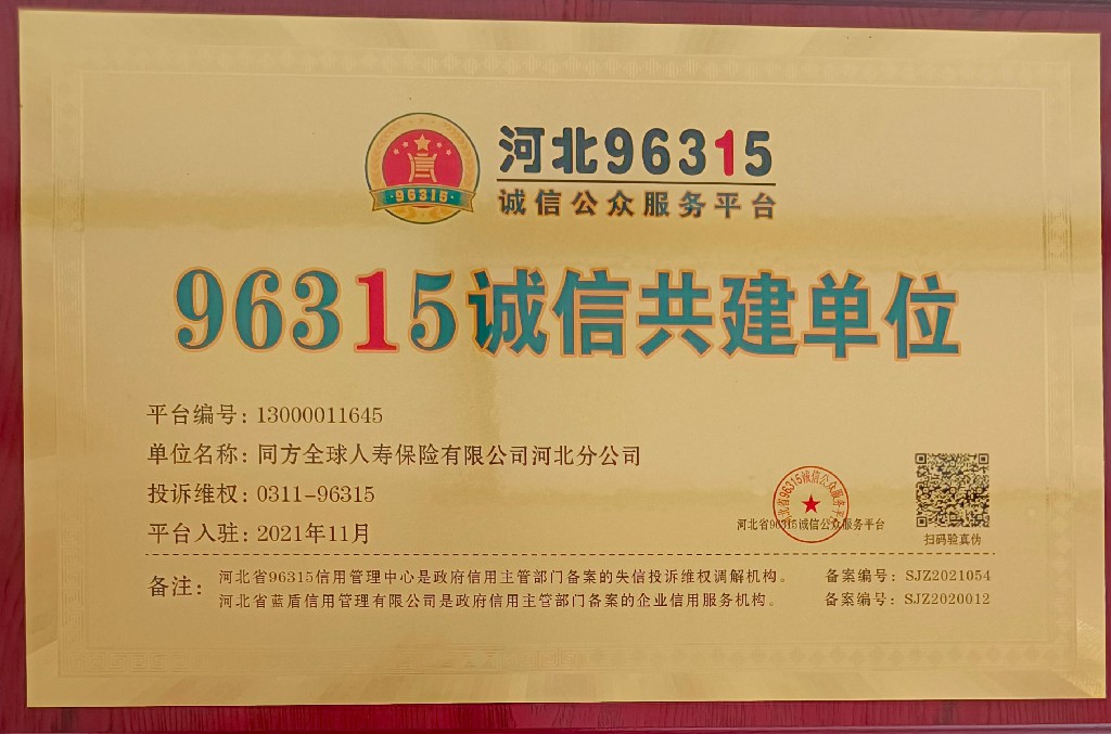 同方全球人寿河北分公司获“96315战略合作单位、96315诚信企业、96315诚信共建单位”荣誉称
