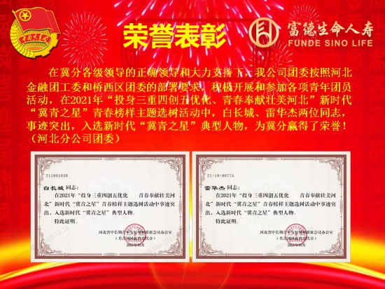 近日,在河北省2021年“投身三重四创五优化,青春奉献壮美河北”评选活动中,富德生命人寿河北分公司白长城、雷华杰同志被共青团河北省委授予新时代“冀青之星”称号。