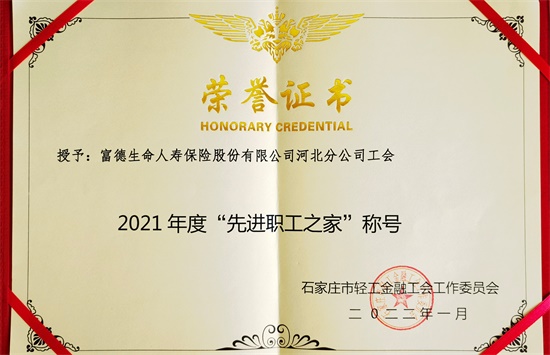 2022年伊始之际,富德生命人寿保险股份有限公司河北分公司工会在石家庄市轻工金融工会开展的2021年度模范先进职工之家评选活动中,从近百家参评企业中脱颖而出,荣获“先进职工之家”称号。