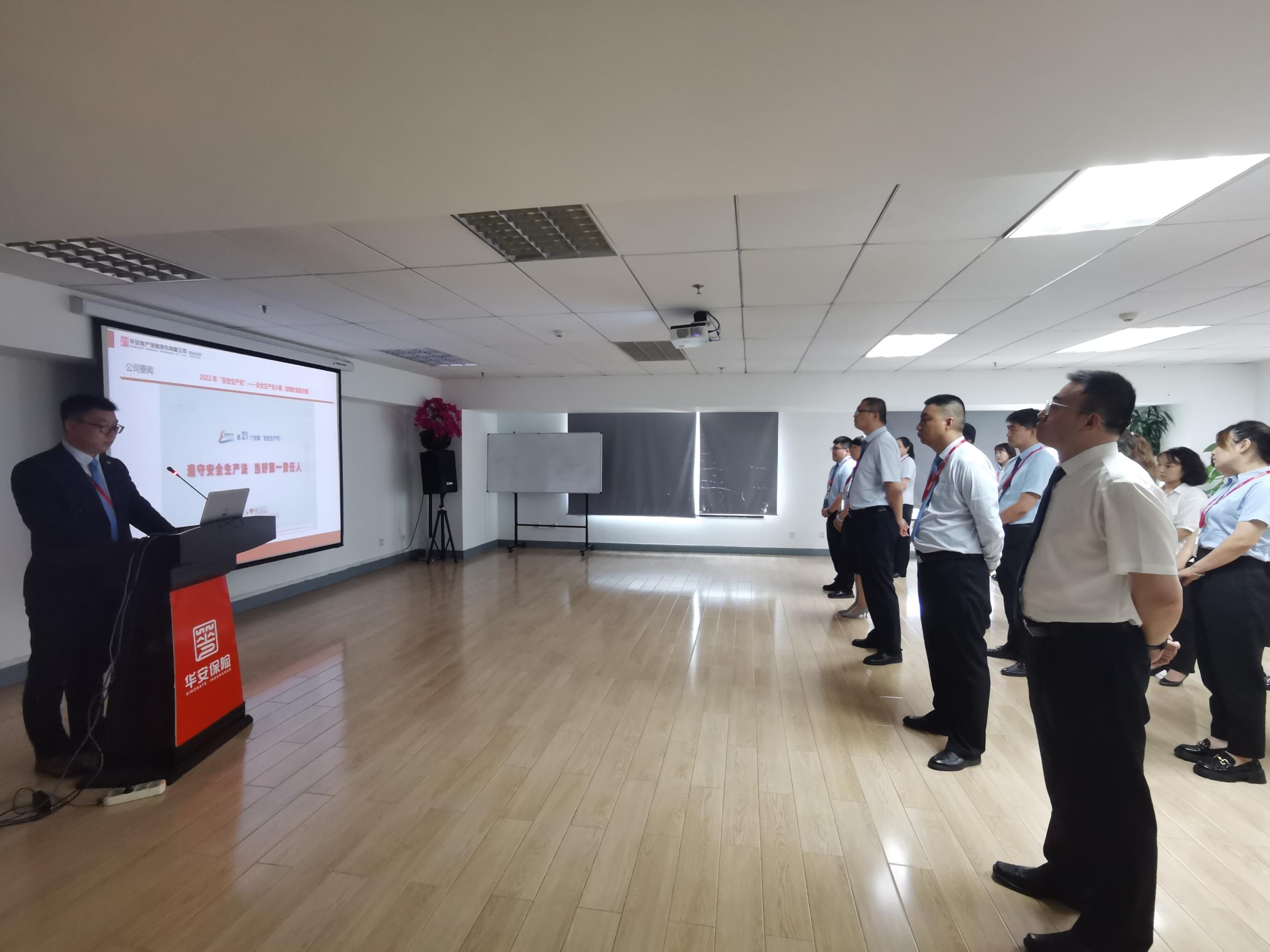 今年6月是全国第21个“安全生产月”,活动主题是“遵守安全生产法,当好第一责任人”。根据《河北银保监局财险处关于开展 2022年全国“安全生产月”活动的通知》(冀银保监财险〔2022〕6 号),结合华安保险总分公司工作部署,6月20日,华安保险石家庄中心支公司利用每周晨会时间,播放安全生产宣传视频进行学习。同步下发《生命重于泰山》 电视专题片,要求各条线、各机构组织全员进行观看学习,帮助员工全面梳理和强化“安全生产无小事,防微杜渐是关键”的意识,坚决筑牢安全生产防线。