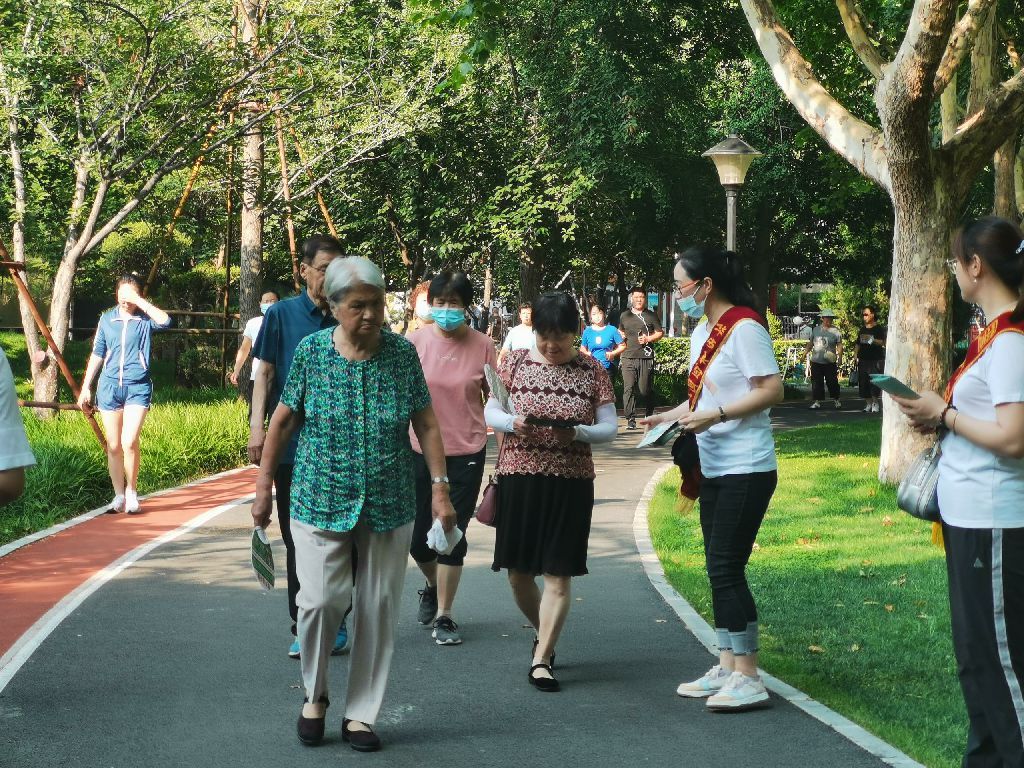 健步走后,大家身披绶带,向公园内晨练的老年人群体发放反欺诈知识折页、“孝心保中老年医疗保险”产品宣传页,针对老年群体保障需求,让最需要保险的人了解保障,规避风险,助力社会大众提升风险意识和保险保障意识。
