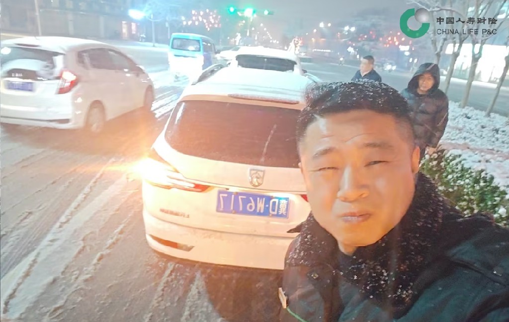 3月1日,石家庄突遭强降雪,路面湿滑结冰,交通事故量激增。傍晚时分,国寿财险石家庄中支查勘员李建接到一起追尾事故报案,客户车辆后保险杠因路滑受损,焦急等待救援。