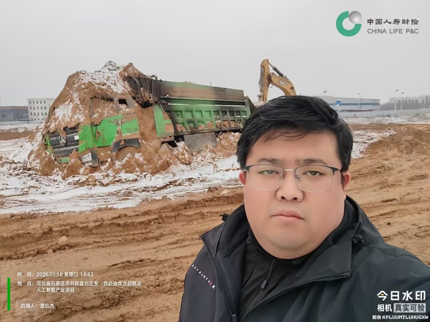 2026年1月18日,石家庄市井陉县迎来降雪,路面湿滑泥泞,事故风险显著增高。当日14时43分,中国人寿财险石家庄查勘员盖应杰接到报案后,迅速前往位于井陉县北正乡优必选华北总部及人工智能产业项目工地的事故现场。